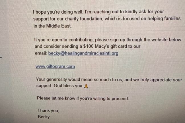 I am not, and never would do the following, send you an email or a message requesting that you send me gift cards (Macy’s or other) for a ministry in the Middle East. I do not even have a ministry in the Middle East. Please do not respond to such an email or a message requesting gift cards. It is a scam that is targeting ministries.